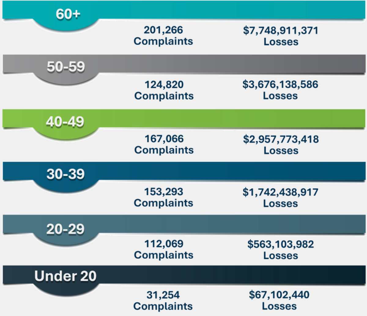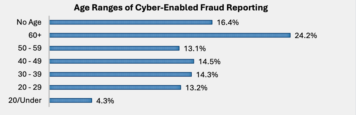 В новом отчёте IC3 мы видим, что 24,3% обманутых пришлось на граждан возрастной категории 60+, это самая массовая возрастная группа по числу обманутых. Потери в денежном эквиваленте у этой возрастной категории тоже максимальные.