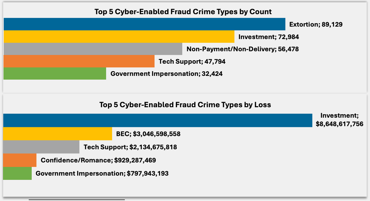 В отчете есть важная развилка между киберпреступлением и кибермошенничеством. IC3 выделяет cyber-enabled fraud — мошенничество с использованием интернета и цифровых сервисов. На такие эпизоды пришлось 452 868 жалоб, то есть 45% всех обращений. При этом именно они дали $17,697 млрд потерь, или около 85% всего заявленного ущерба за год. Это одна из главных цифр всего отчета: меньше половины жалоб создают почти весь денежный урон.