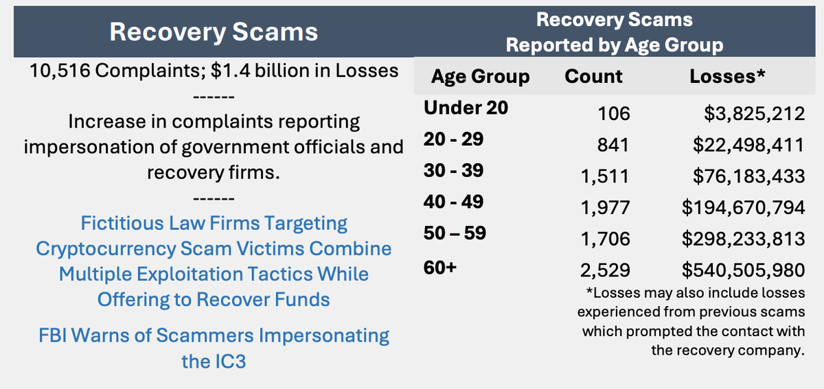 Еще одна важная категория — recovery scams, то есть мошенничество под видом возврата ранее украденных денег. IC3 зафиксировал 10 516 таких жалоб и $1,4 млрд потерь. Обычно к жертве приходят уже после первого эпизода. Контактирует «юрист», «специалист по блокчейн-розыску», «агент регулятора», «частный детектив» или «представитель биржи». Человеку обещают вернуть украденное, но просят оплатить проверку, судебные издержки, страховку, пошлину, комиссию за перевод или «подтверждение личности». По сути это вторая стадия старого обмана, рассчитанная на человека, который уже потерял деньги и находится в уязвимом состоянии.