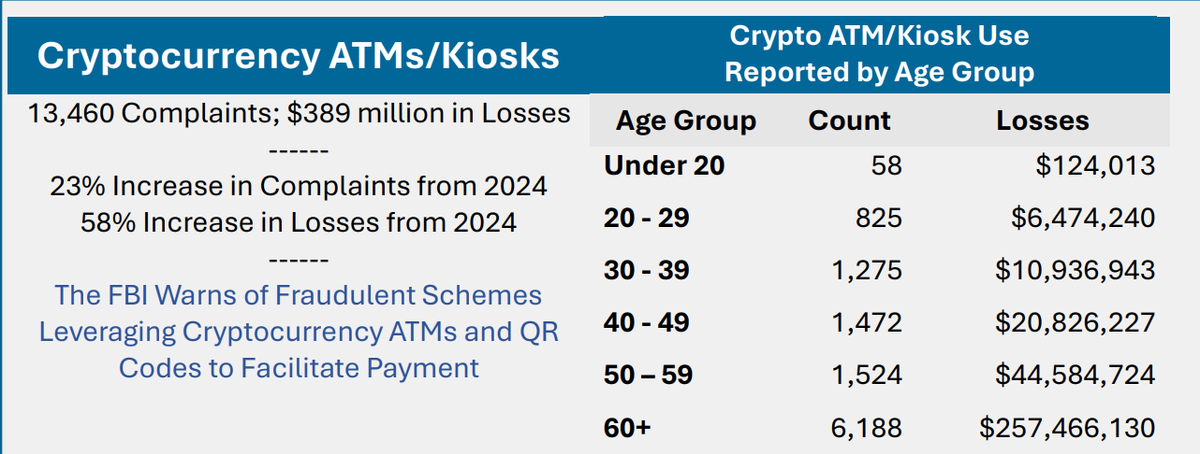 IC3 выделил в отчете и схемы через криптобанкоматы и криптокиоски. Речь идет о специальных терминалах, через которые можно внести наличные или перевести деньги в криптовалюту на указанный адрес. За год IC3 получил 13 460 жалоб по таким эпизодам. Потери составили $389 млн. Число обращений выросло на 23%, сумма ущерба — на 58%. Больше всего денег потеряли люди старше 60 лет: $257,5 млн.