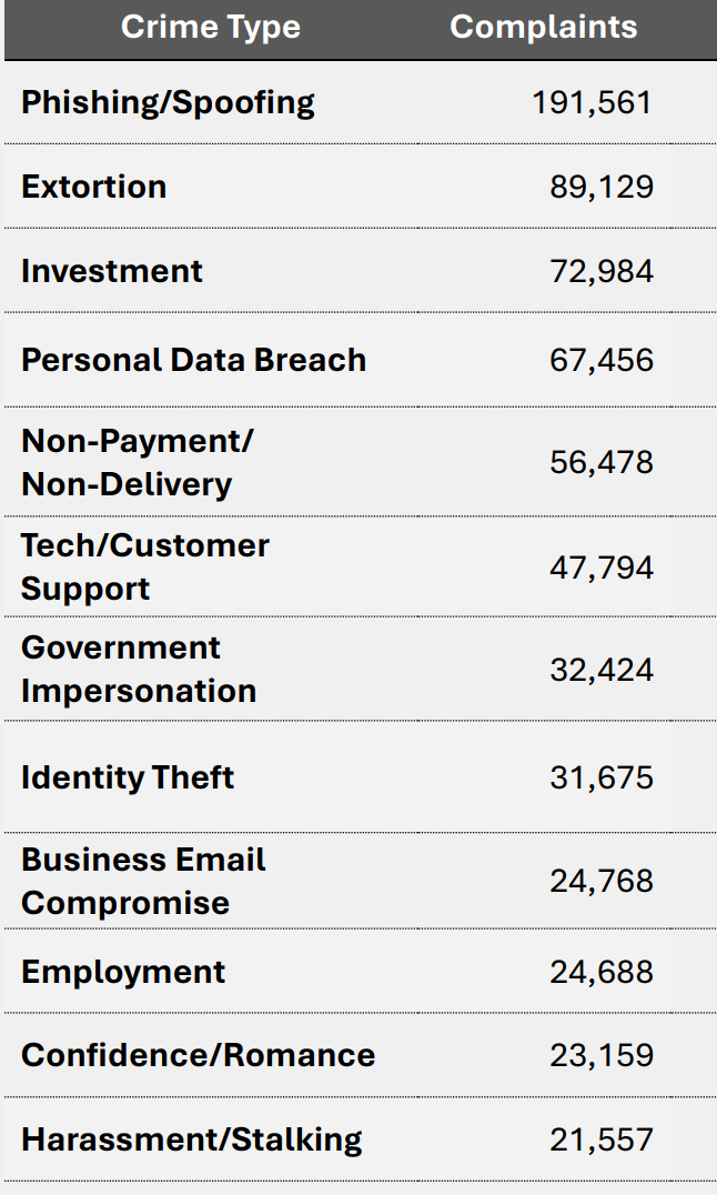 Массовые и самые дорогие схемы — разные вещи. Самая заметная перемена в отчете связана не с числом жалоб, а с их стоимостью. По количеству обращений лидируют фишинг и подмена отправителя — 191 561 случай, вымогательство — 89 129, инвестиционные аферы — 72 984.