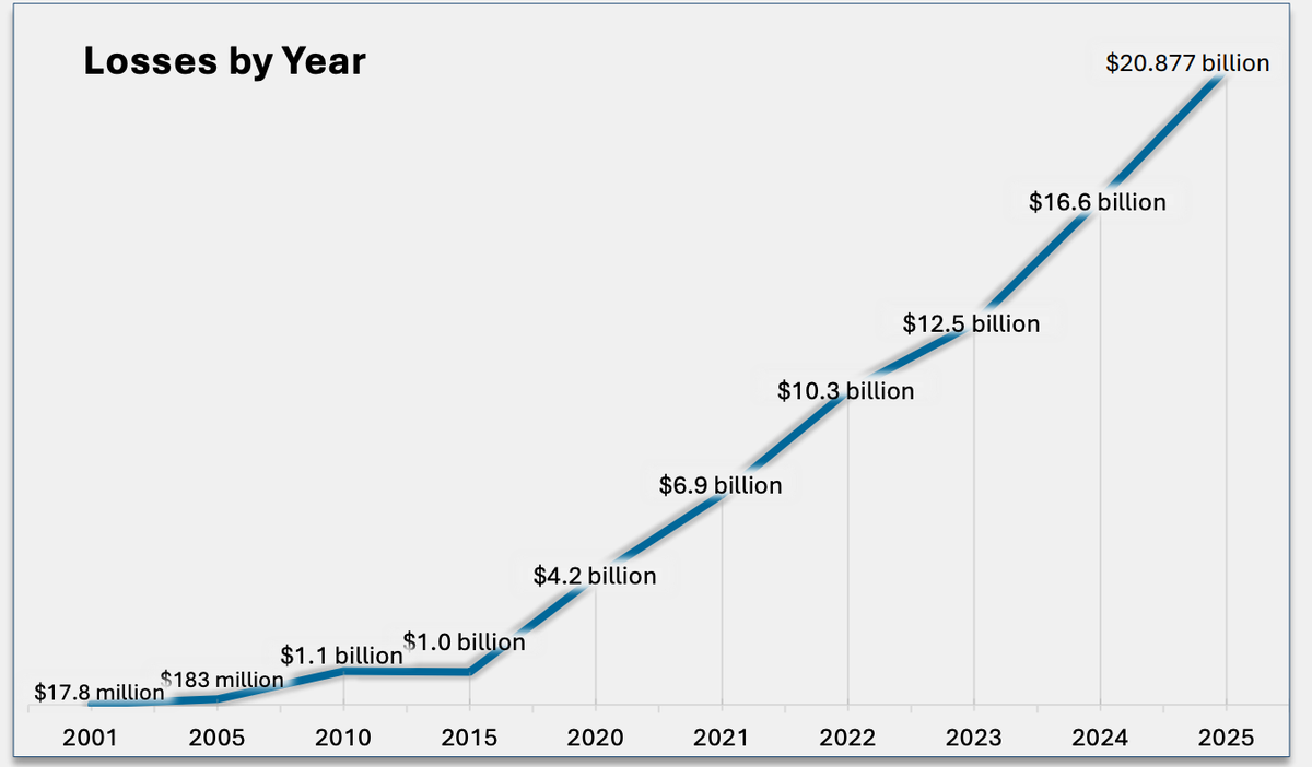 В 2025 году Центр жалоб на интернет-преступления FBI, IC3, получил 1 008 597 обращений. Общая сумма заявленного ущерба достигла $20,877 млрд. Это новый максимум за всю историю отчета. В самом документе IC3 отдельно отмечает еще две важные цифры: средний ущерб на одну жалобу составил $20 699, а поток обращений приблизился к 3 тысячам в день. Масштаб уже давно вышел за рамки частных историй из новостей и превратился в огромные цифры ущерба в статистике.