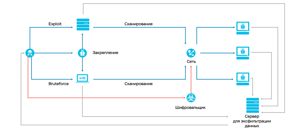 Так мы видим, что злоумышленники чаще строят атаку не вокруг одного инструмента, а вокруг цепочки проникновения и закрепления. Это соотносится с типовой схемой инцидента, которую приводит Банк России: получение первоначального доступа, закрепление в инфраструктуре, сбор информации, горизонтальное перемещение, эксфильтрация данных и затем шифрование инфраструктуры.