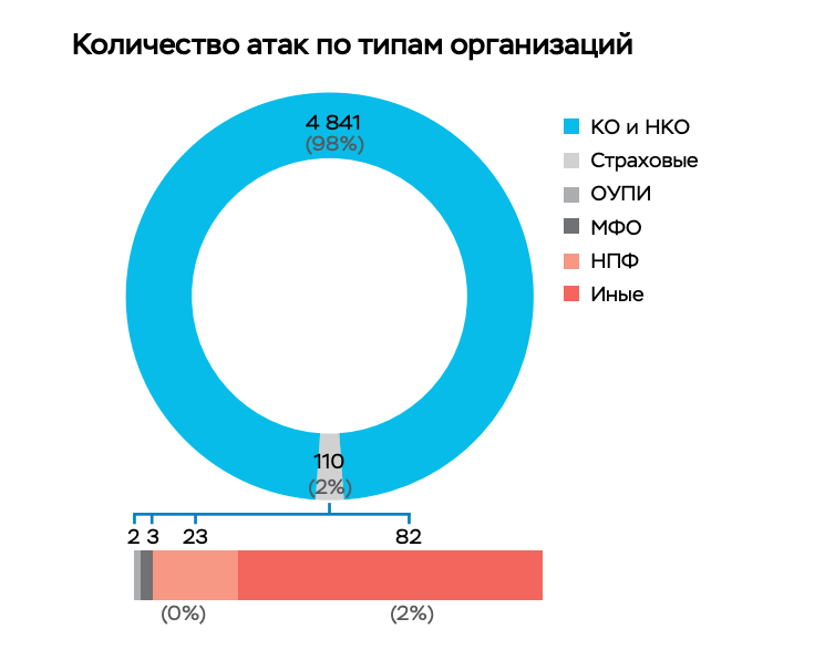 Распределение атак по типам организаций показывает явное доминирование кредитных организаций и НКО. На них в 2025 году пришлось 4 841 атака, или 98% всего массива, рассмотренного ФинЦЕРТ. На страховые организации пришлось 110 атак, а на остальные категории — существенно меньше.