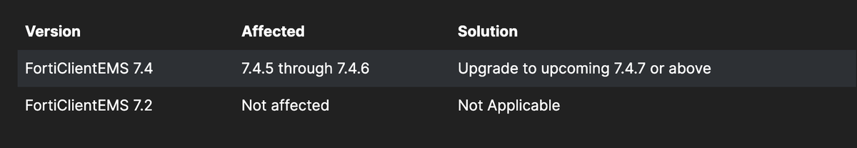 Проблема затрагивает FortiClient EMS 7.4.5 и 7.4.6. Ветка 7.2 не затронута. Постоянное исправление войдет в будущую версию 7.4.7, а до ее выхода защититься можно с помощью срочных исправлений для 7.4.5 и 7.4.6. Патч компания выпустила в выходные, уже после подтверждения эксплуатации уязвимости.