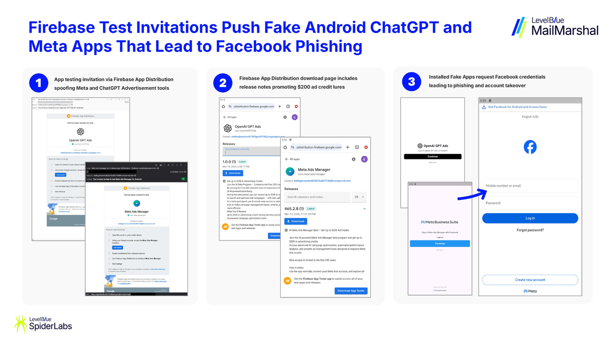 Злоумышленники запустили новую фишинговую кампанию против пользователей Android. В качестве приманки они используют приглашения протестировать ранние версии приложений ChatGPT и инструментов Meta (запрещена в РФ) для рекламы. Главная опасность в том, что письма приходят через реальную инфраструктуру Firebase App Distribution, поэтому сообщение выглядит правдоподобно и у многих не вызывает подозрений. Об этом сообщили исследователи SpiderLabs.