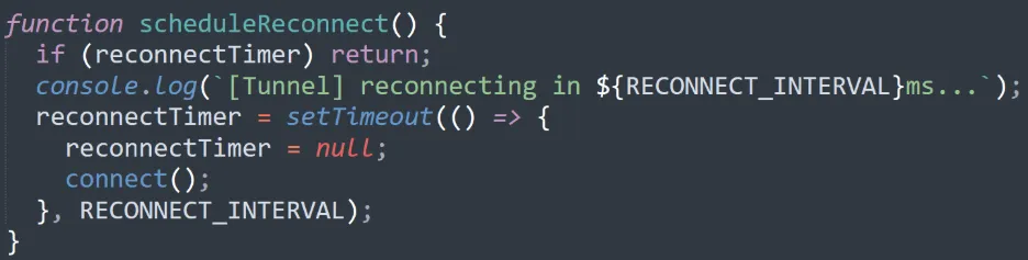 Это реализовано с помощью функции scheduleReconnect, которая отвечает за восстановление туннеля WebSocket в случае его потери.