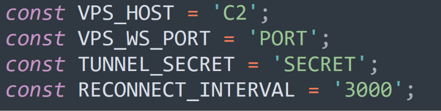 VPS_HOST и VPS_WS_PORT идентифицируют удаленный ретрансляционный сервер; TUNNEL_SECRET предоставляет базовый токен аутентификации, а RECONNECT_INTERVAL показывает, что вредоносная программа предназначена для восстановления туннеля в случае разрыва соединения.