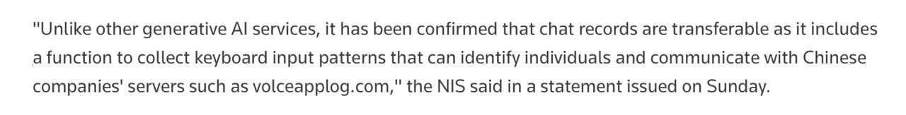 Приложение с ИИ DeepSeek втихаря передавало чаты пользователей на серверы в Китае. Всё легально, в “пользовательском соглашении” где-то на 43-й странице.